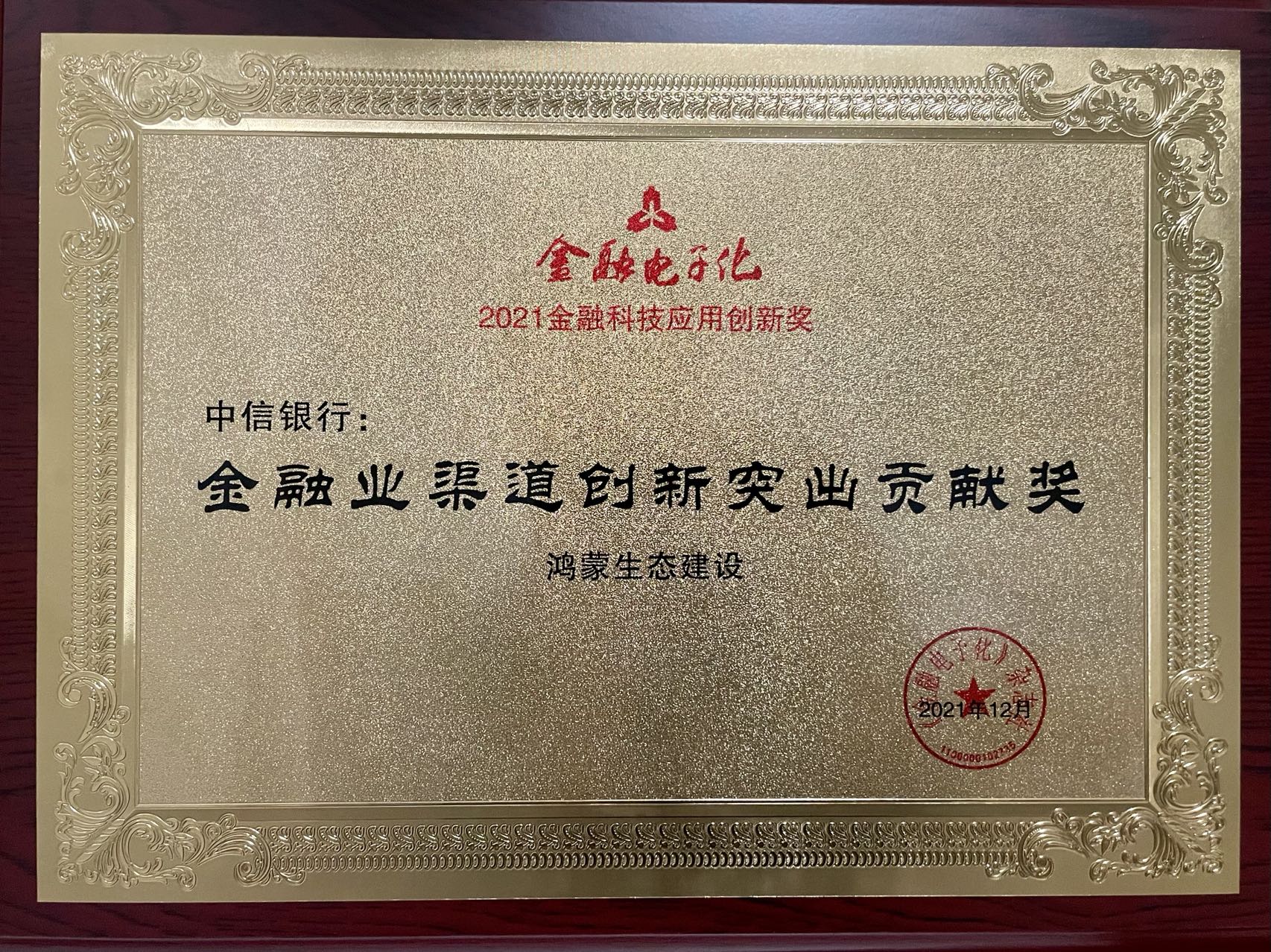 2021年底,我行鸿蒙生态建设项目,荣获中国人民银行主管《金融电子化》杂志颁发的"金融业渠道创新突出贡献奖",获得业界广泛认可。